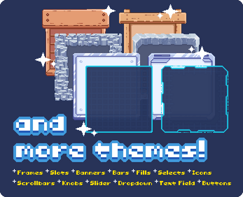 VERSION 2.4 "Runewood" New UI Theme. 205 Unique Assets and 425 in Total with Variations.Frame, Banner, Title, List, Marker, Slot, Cursor, Icons, Scrollbar, Fillbar, Slider, Dropdown Gamepad, Keyboard, Buttons, Speech Bubble, Direction, Loading, Toggle, Profile, etc. Pending... GUI Essential is a starter package to build User Interface design for your indie games. There are more than 800 assets such as Basic, Paper, Wood, Stone, Metal, Hologram, and Custom themes. They all come with various small elements such as buttons, scrollbars, icons, etc. Besides that, this pack also included an original font created by me, the Toriko Font. You can use the 9-slicing Sprites technique in Unity to create a resizeable form, this asset uses 32x32 size. *animated for demonstration only Each theme included frames, slots, banners, bars, fills, selects, icons, scrollbars, knobs, sliders, dropdowns, text fields, and buttons. Each theme comes with selection animation and button animation. All files are provided in Aseprite and PNG formats. For your convenience, each theme is exported in one full sprite sheet. Free Version It only included the Flat Theme. Full Version Included all the collections, themes, font, and future contents! Currently available themes (13): Flat, Gradient, Paper, Wood, Stone, Metal, Hologram, Glass, Pumpkin, Mystic Wood, Papernote, and Metalworks, Runewood. Attribution 4.0 International (CC BY 4.0) You are free to: Share — copy and redistribute the material in any medium or format for any purpose, even commercially. Adapt — remix, transform, and build upon the material for any purpose, even commercially. The licensor cannot revoke these freedoms as long as you follow the license terms. Under the following terms: Attribution - You must give appropriate credit, provide a link to the license, and indicate if changes were made. You may do so in any reasonable manner, but not in any way that suggests the licensor endorses you or your use. No additional restrictions - You may not apply legal terms or technological measures that legally restrict others from doing anything the license permits. License Link: https://creativecommons.org/licenses/by/4.0/ With your help and support it is a great opportunity for me to improve the product's quality and future development, simply just answer some questions I provided in a Google Form. Visit this link to begin: https://forms.gle/Ko2Jh1nt1K8qSJu9A Follow me on Twitter! https://twitter.com/crusenho Unable to purchase with Debit/Credit Card? There is no card payment support in my country yet, so the only option is using PayPal for transaction. But rest assured, I have another alternative and you can buy it from my another store site. Here is the link to the product: https://www.gamedevmarket.net/asset/complete-gui-essential-pack AND MORE
