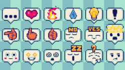 Are you needing some emotion added to your RPG? Look no further: 32 animated emotion bubbles: Neutral; Angry; Sad; Laughing; Eager; Shocked; Speechless; Sleepy; Quiet; Dizzy; Love; Surprised; Confused; Thinking; Idea; Lit; Inviting; Pointing Up; Pointing Down; Pointing Left; Pointing Right; Drooling; Kissing; No; Yes; Tongue Out; Prohibited; Headblown; Adorable; Thumbs Up; Sweating; Frustrated; All sprites are 32x32;